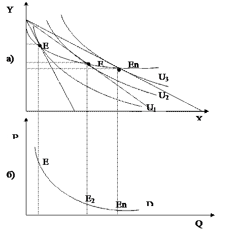 С последовательным снижением цен на товар X при неизменном доходе и постоянной цене Y, потребитель замещает относительно подорожавший товар Y на Х. В этом случае бюджетная линия смещается вправо и получаются точки оптимума Е1, Е2,… Еn, по которым можно построить кривую «цена-потребление». Если эту кривую построить в координатах P-Q, то мы получим кривую спроса D (см. рис. 3.6).