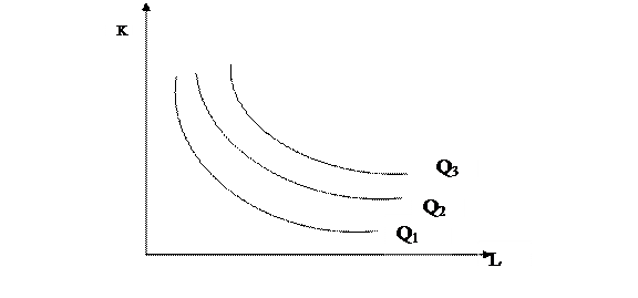 На рисунке показано, что объем производства Q1, Q2, Q3 может быть достигнут при разных комбинациях факторов производства. Верхняя часть изокванты отражает капиталоемкие, нижняя – трудоемкие технологии.