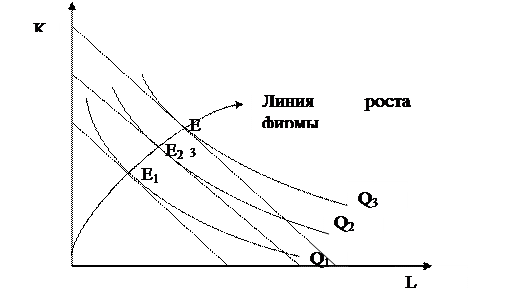 Если бюджет производителя возрастает, он получает возможность выходить на новые изокванты. Каждая точка касания (Е1, Е2, Е3) показывает такую комбинацию факторов, которая соответствует минимуму затрат на производство данного объема продукции, обозначенного на изокванте. Соединив точки, получим линию роста фирмы (рис.4.5).