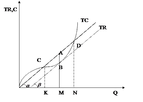 Максимальная прибыль достигается, когда разрыв между TR и ТС наиболее велик (отрезок АВ). Точки С и D являются точками критического объема производства. До точки С и после точки D совокупные издержки превышают совокупный доход (TC>TR), такое производство экономически убыточно и потому нецелесообразно. Именно в интервале производства от точки К до точки N предприниматель получает прибыль, максимизируя ее при выпуске М.