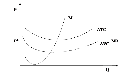 Для каких то фирм рыночная цена оказывается на уровне средних переменных издержек (Р=АVC). В этом случае фирма понесет убытки, так как ее средние издержки будут выше цены (AC>P). Однако какое то время она может продолжать работать, так как в противном случае ей грозят чистые убытки в размере постоянных издержек, которые существуют даже при нулевом выпуске. Такие фирмы получили название предельных.