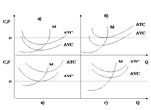 Рис. 4.10 Классификация фирм в условиях краткосрочного равновесия: а) допредельная фирма со сверхдоходом; б) допредельная фирма с нормальной прибылью; в) предельная фирма; г) запредельная фирма