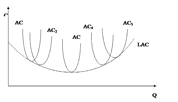 Соединив точки минимума АС1, АС2, АС3, ….., АСn, получим средний издержки в долгосрочном периоде LAC. При условии, что цены на используемые факторы производства остаются неизменными, уменьшение средних издержек в долгосрочном периоде до Qопт объясняется тем, что с расширением производства темпы прироста готовой продукции начинают обгонять скорость прироста издержек на используемые факторы производства.
