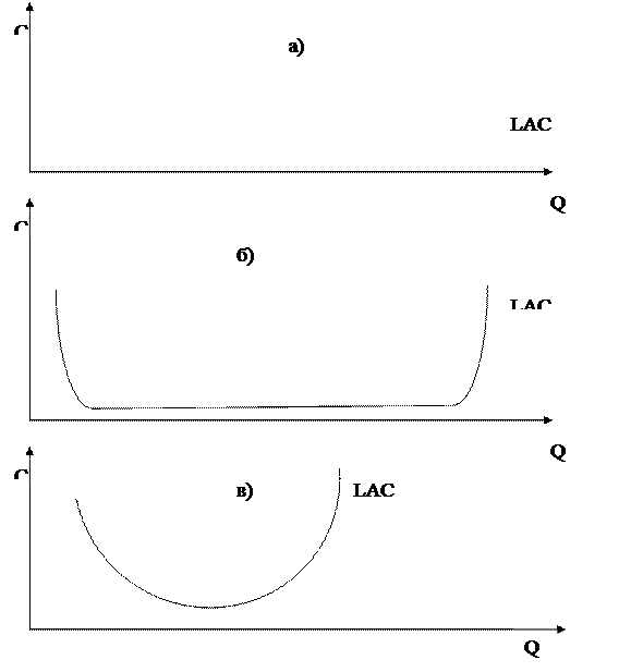 Если имеет место положительный эффект масштабов производства, то кривая LAC имеет значительный отрицательный наклон (рис.4.12 - a); если имеет место постоянная отдача от роста масштаба, то она горизонтальна (рис.4.12 – б); в случае увеличения издержек от роста масштабов производства кривая устремляется вверх (рис. 4.12 - в).