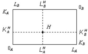Длина сторон прямоугольника определяется заданными количествами труда и капитала. На нижней стороне прямоугольника откладывается количество труда, а на левой стороне - количество капитала, использующиеся при производстве блага А. Верхняя и правая стороны прямоугольника используются соответственно для отображения объемов труда и капитала, занятых в производстве блага В. Каждая точка в коробке Эджуорта представляет определенное межотраслевое распределение факторов производства. Так, точка H указывает на то, что для производства блага А выделено LHA труда и KHA капитала, в производстве блага В занято LHB труда и KHB капитала | . | ||