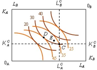 Теперь любая точка в коробке Эджуорта представляет шесть параметров: количества капитала и труда, используемые при производстве каждого из благ, и объемы их производства. Так, точка С указывает на то, что при производстве блага А занято KCA капитала и LCA труда, что позволяет произвести 30 единиц этого блага; оставшееся количество факторов (KCB, LCB) используется для выпуска блага В, что при данной технологии позволяет произвести 35 единиц этого блага.