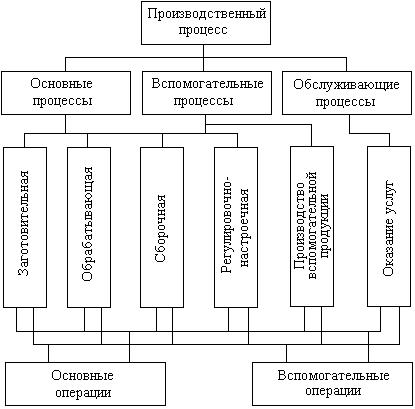 Производственный процесс представляет собой совокупность взаимосвязанных основных, вспомогательных и обслуживающих процессов в целях создания определенной продукции (рис. 1).