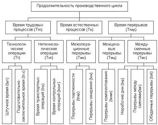 Продолжительность производственного цикла изготовления продукции – это календарный период времени, в течение которого материалы, полуфабрикаты и комплектующие изделия превращаются в готовую продукцию. Продолжительность производственного цикла, как правило, выражается в календарных днях. Знание продолжительности производственного цикла необходимо для составления производственной программы предприятия и его подразделений, для определения сроков начала производственного процесса (запуска) по данным сроков его окончания (выпуска) и для расчетов нормальной величины незавершенного производства. Продолжительность производственного цикла зависит от времени трудовых и естественных процессов, а также от времени перерывов в производственном процессе (рис.2).