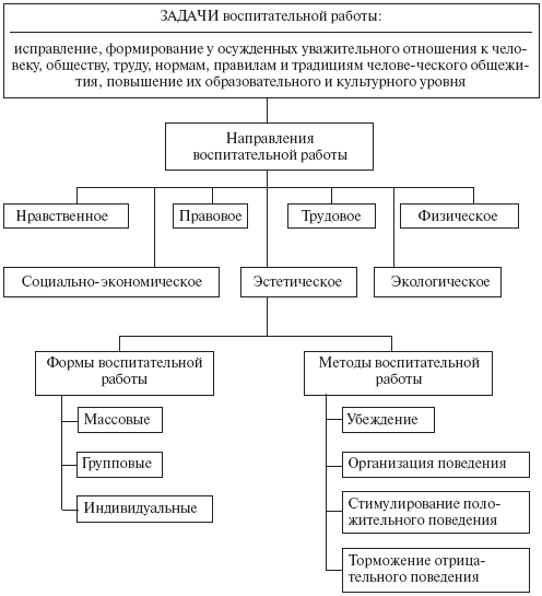 Воспитательная работа согласно ст. 9 УИК РФ признается одним из основных средств исправления осужденных. В Концепции воспитательной работы с осужденными в условиях реформирования уголовно-исполнительной системы, утвержденной 20 апреля 2000 г., воспитательная работа – это система педагогически обоснованных мер, способствующих преодолению личностных деформаций осужденных, их интеллектуальному, духовному и физическому развитию, правопослушному поведению и социальной адаптации после освобождения. В соответствии с ч. 1 ст. 109 УИК РФ задачами воспитательной работы с осужденными к лишению свободы являются их исправление, формирование у осужденных уважительного отношения к человеку, обществу, труду, нормам, правилам и традициям человеческого общежития, повышение их образовательного и культурного уровня.