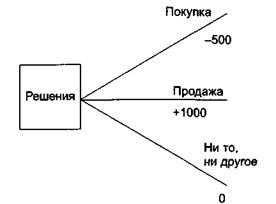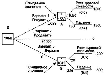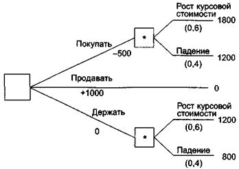 Предположим, что мы владеем акциями стоимостью 1000 у.е. Мы должны принять решение относительно того, держать ли акции, продать их все или купить еще акции на сумму 500 у.е. Вероятность 20%-го роста курсовой стоимости акции составляет 0,6, а вероятность снижения курсовой стоимости на 20% — 0,4. Какое решение необходимо принять с тем, чтобы максимизировать ожидаемую прибыль?
