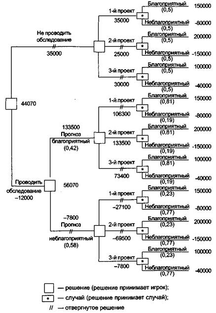Компания заказала фирме прогноз состояния рынка и фирма утверждает, что ситуация будет благоприятной с вероятностью 0,42 (дерево решений изображено в середине рис. 3.6) и ситуация будет неблагоприятной с вероятностью 0,58 (дерево решений построено на рис. 3.6 внизу) При построении дерева решений развитие событий происходит от корня дерева к исходам, а расчет прибыли выполняется от конечных состояний к начальным. Из анализа решения следует, что проведение дополнительных исследований конъюнктуры рынка существенно уточняет принимаемое решение. Если фирма прогнозирует благоприятную ситуацию на рынке, то целесообразно проводить реконструкцию по второму проекту, если прогноз неблагоприятный — по третьему проекту.