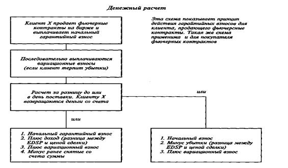 Денежный расчет подобен расчету при закрытии обязательств до поставки. Фирме—члену биржи и клиентам фирмы производятся выплаты, состоящие из начального гарантийного взноса, всех ранее внесенных вариационных взносов за вычетом всех ранее снятых со счета сумм и убытков (плюс доходы) при "игре" на бирже. Таким образом, покупателям и продавцам возвращаются их взносы с учетом доходов или убытков при торговле фьючерсными контрактами.