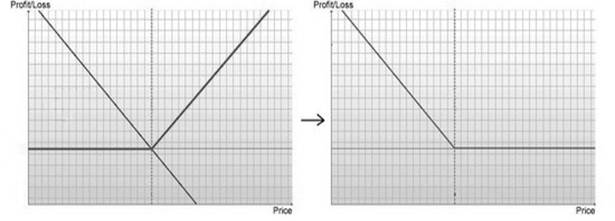Синтетические позиции — это позиции, которые можно построить, комбинируя опцион и базовый актив в портфеле, получая при этом график прибылей и убытков, полностью аналогичный опционным конструкциям без применения базового актива. На иллюстрации графически продемонстрирован пример, как комбинируя длинную позицию по опциону call и короткую позицию по базовому активу, можно получить PL, абсолютно эквивалентный длинной позиции по опциону put
