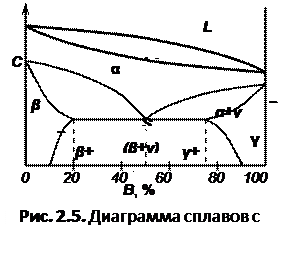 Вид диаграмм состояния, в которых компоненты испытывают полиморфные превращения, зависит от характера взаимодействия аллотро-пических модификаций компонентов. В ряде случаев они напоминают обычные диаграммы, расположенные этажами. Нередко в таких системах встречаются превращения, сходные по виду с эвтектическими, но с распадом не жидкости, а твердого раствора. Превращения подобного типа, в отличие от эвтектического, называют эвтекто-идным. На рис. 2.5. представлена диаграмма состояния сплавов твердых растворов с эвтектоидным превращением.