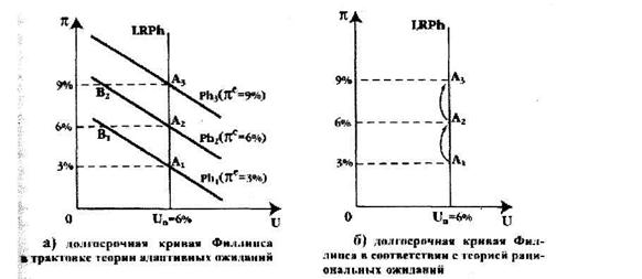 Итак, краткосрочная модель Филлипса уже не соответствовала изменившейся ситуации. В 1979г. М.Фридменом была предложена гипотеза естественного уровня безработицы. Статистические данные за 1970-е и SO-e гг. показывали, что в условиях стагфляции, просуществовавшей почти до конца 1980-х гг., краткосрочная кривая Филлипса смещается вправо вверх, что соответствует инфляции издержек. Устойчивость уровня безработицы (около 6-7%) при отсутствии ее циклической составляющей, с одной стороны, и продолжение роста темпов инфляции, с другой, были положены в основу модели долгосрочной кривой Филлипса. Расхождения экономистов в толковании долгосрочной кривой Филлипса привели к возникновению двух вариантов гипотезы естественного уровня безработицы - теории адаптивных ожиданий и теории рациональных ожиданий. Обе теории показывают, как срабатывают инфляционные ожидания экономических агентов в процессе их приспособления к изменению экономической политики правительства в условиях полной занятости, или естественного уровня безработицы.