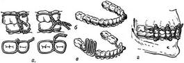 а — межчелюстное связывание зубов лигатурной проволокой (слева — с образованием дополнительной петли по Айви, справа — о непосредственным скручиванием концов лигатур); б — одночелюстная гладкая шина-скоба из алюминиевой проволоки; в — проволочная шина с опорной плоскостью и распорочным изгибом в области отсутствующих зубов; г — проволочная шина с зацепными петлями, скрепленными резиновыми колечками.