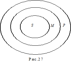 B ней отношение терминов может быть проинтерпретировано с помощью кругов Эйлера как отношение между объемами имен S, M и P (рис.27). Очевидно, что если M подчинено P, а S подчинено M, то S с необходимостью будет подчинено P, и мы должны признать, что все S суть P. Значит, заключение «Все квадраты – параллелограммы» следует из заданных посылок.