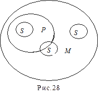 Обозначив через S, M и P соответственно термины «Участники движения «Идущие вместе», «выступающие против порнографии» и «фашисты», мы получим их формы PаM и SаM. В них как P, так и S подчинены M, но отношение между S и P однозначно установить не удается. При таком отношении крайних терминов к среднему можно получить несовместимые схемы (например, SаP и SеP), которые, как известно, соотносятся с высказываниями, не могущими быть одновременно истинными, одно из них непременно ложно (рис.28).