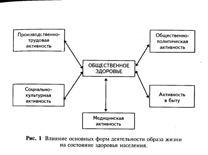Какие же формы деятельности влияют на здоровье человека? На рис. 1 представлены основные формы деятельности ОЖ, оказывающие влияние на состояние здоровья населения (по Ю.П. Лисицыну).