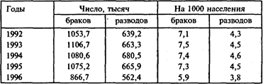 Небольшая статистика. В 1995 году в России вступили в брак 1075219 человек (7,3 на 1000 населения), а развелись 665904 человека (4,5 на 1000 населения), т.е. каждый второй брак неудачен. А вроде бы все по любви, взаимопониманию. Столько грез, переживаний, надежд, планов... и вдруг. А вдруг – это причины. Да, о причинах, о которых мы с Вами говорили в предыдущих лекциях, и будем говорить сейчас. Внимательно посмотрите на табл. 3, в которой представлена статистика браков и разводов. Обратите внимание на снижение показателей заключения браков. Эта тенденция прослеживается и в 1997, и в 1998 г.
