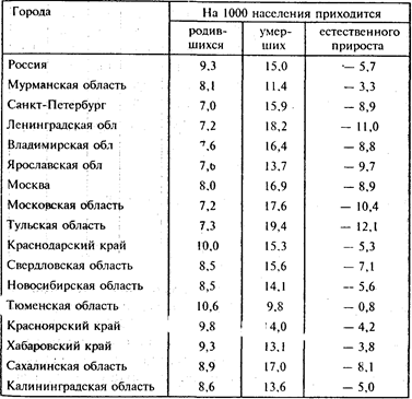 Представленные данные наглядно показывают отрицательный характер естественного прироста населения по всем регионам России. Крупные города, такие как Москва (-8,9), С.-Петербург (-8,9), как и области, прилегающие к этим городам, имеют довольно высокий отрицательный показатель естественного прироста, что говорит об убыли населения, т.е. число умерших значительно превышает число родившихся.