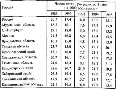 О причинах смерти детей первого года жизни мы с Вами уже знаем по предыдущим лекциям. Напомню, что наиболее весомыми причинами являются: врожденные аномалии, болезни органов дыхания, инфекционные и паразитарные болезни. Наиболее негативной причиной является состояние, возникающее в перенатальном периоде, на который приходится от 88,0 случаев смерти в 1993 году до 78,5 в 1995 году на 100 тысяч родившихся детей. Наиболее высокая младенческая смертность (см. табл. 12) в Сахалинской (22,7), Тюменской (21,3) и Тульской (20,1) областях. В Москве – 15,5, С.-Петербурге – 15,8, а лучший показатель в Ярославской области - 12,0. И эти показатели значительно ниже средних по России, в динамике в крупных городах она снижается.