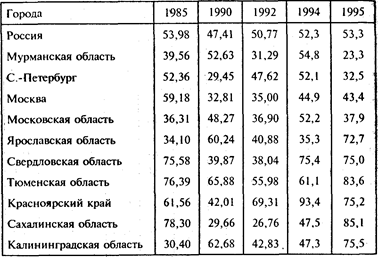 Обеспеченность населения (выборочно) на 10 тысяч человек населения выглядит так: по России обеспеченность врачами всех специальностей была в 1985 году 38,6, в 1994 году – 39,6; средним медицинским персоналом, соответственно, 97,0 и 94,4, а по отдельным городам Москвы (1), С.-Петербурга (2), Ярославской области (3), Красноярского края (4) и Тюменской (5) и Калининградской области (6) следующие: (1) – 78,1 (1985 г.) и 68,6 (1994 г.) – обеспеченность врачами, 122,0 и 105,7 средним медицинским персоналом. Остальные цифры в порядке перечисления городов по номерам: