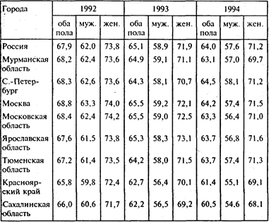 Средняя продолжительность жизни (ожидаемая) по России при рождении 1992-1994 гг. у мужчин в среднем ожидается 57,6 лет и женщин – 71,2 года (1994 г.). По Москве и С-Петербургу средняя продолжительность предстоящей жизни у мужчин 57,4 и женщин – 71,5 года (средний возраст 64,4; 1994 г.) и 58,1 и 71,2 (средний возраст 64,5).