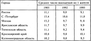 А вот показатели медицинской помощи довольно высокие как раз в двух крупнейших городах, т.е. Москве и С.-Петербурге. В Москве в 1985 году среднее количество посещений было 15,2; в 1992 г. – 9,7; и в 1995 г. – 9,8; в северной столице – 15,4; 10,6; 11,0, что значительно превышает средние показатели по России. По обеспеченности населения койками Москва и С.-Петербург имеют неоднозначные показатели.