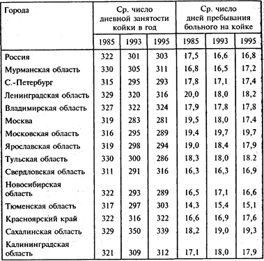 В среднем по России занятость койки в год чуть больше 300 дней (с 1985 по 1995 гг.), а среднее пребывание больного составляет чуть больше 17 дней. Примерно такие же показатели и по рассматриваемым городам.