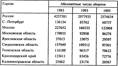 Средние величины по городам трудно сравнить, тем более по г. Москве, где в настоящее время пребывают миллионы вынужденных мигрантов – беженцев и приезжих ближнего и дальнего зарубежья, о чем упоминалось выше. Данные в абсолютных числах, представленных в табл. 17, не включают статистические данные по мини-абортам при малых сроках беременности. Эти показатели анализируются отдельно. Существует и другой показатель – частота абортов. К сожалению, этих данных по регионам нет, а в целом по России они следующие: в 1985 г. – 184,2, в 1993 г. – 250,1. Число абортов на 100 родившихся живыми и мертвыми составило 200,4, т.е. в сравнении с 1985 годом заметное увеличение количества абортов, но данный показатель по всей ведомствам был самым высоким в 1993 г. и равнялся 250,1 абортов в год.