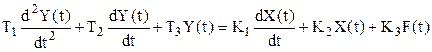 Первая форма записи. Дифференциальное уравнение записывается так, чтобы выходная величина и ее производная находились в левой части уравнения, выходная величина и все остальные члены уравнения – в правой части, например