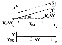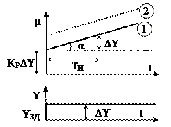 В начальный момент времени регулирующее воздействие скачкообразно изменяется на величину Y0KP, а затем плавно возрастает и за время интегрирования увеличивается еще на величину входного сигнала.