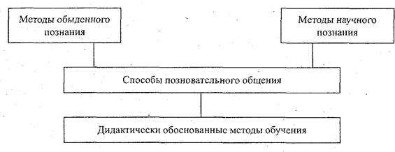 Ледагогически переработанные методы обыденного и научного познания включаются в процесс обучения с помощью разнообразных форм познавательного общения, почерпнутых в дидактически преобразованном виде из общественных отношений. Научная информация — факты, сведения, обобщения, гипотезы, концепции, теории — излагается в статьях, книгах, в научных обобщениях, докладах с использованием демонстраций, иллюстраций, моделей. Истина выявляется в ходе обсуждений, дискуссий, публичных защит, диспутов. Задача дидактики состоит в том, чтобы с учетом жизненного опыта детей, их возрастных особенностей включить педагогически переработанные методы обыденного и научного познания и обучающее взаимодействие учителя и учащихся в познавательное общение. В результате формируется система способов обучающего взаимодействия педагогов и детей, собственно методов обучения. Природная основа методов обучения схематически выглядит так: