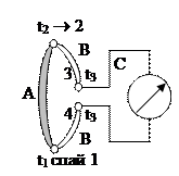 В цепь измерения включается третей проводник С, при этом спай 1 – рабочий, спай 2 – свободный, а спаи 3 и 4 - нейтральные. t3 должна быть постоянной