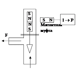 Для передачи положения поплавка используется магнитная муфта, которая состоит из двух магнитов. Один сдвоенный, который перемещается вместе с поплавком, а другой укреплен на рычаге преобразователя перемещения в давление и двигается вместе с рычагом за первым магнитом.