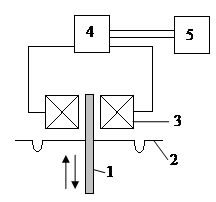 Пластина 1 закреплена на мембране 2. Нижняя часть пластины погружена в жидкость, а верхняя находится в катушке 3, соединенной с генератором импульсов 4. при включении катушки в пластине возникают продольные колебания. Затем катушка отключается от генератора, и колебания затухают.