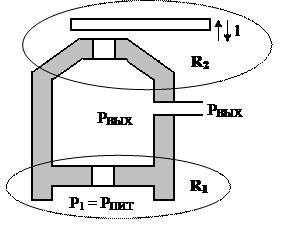 Давление питания РПИТ подводится через постоянный дроссель R1, а выходным сигналом делителя является промежуточное давление РВЫХ.