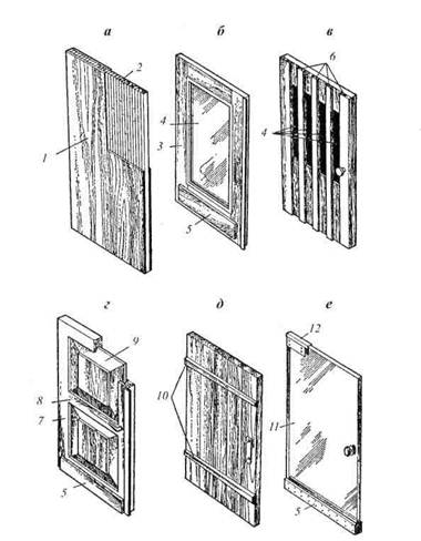 Рис. 3.46. Дверные полотна: а — щитовые; б — обвязочные; в — решетчатые; г — филенчатые; д — плотничные; е — из закаленного стекла; 1 — облицовка; 2 — реечный щит; 3 — дощатая рама; 4 — стекло; 5 — нижняя отбойная планка; 6 — вертикальные рейки;