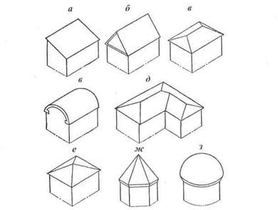 Рис. 3.47. Формы скатных крыш: а — односкатная; б — двускатная; в — четырехскатная; г — сводчатая; д — многоскатная; е — шатровая; ж — пирамидальная; з — купольная