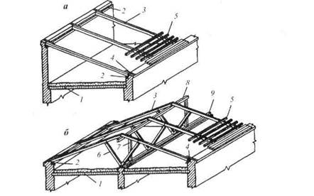 Опорные фермы устанавливают на деревянные прокладки, уложенные по кирпичным или бетонным столбикам, и крепят к ним скрутками из проволоки. Стропильные щиты состоят из стропильных ног, связанных сверху обрешеткой, а снизу — диагональными связями. Нижними концами щиты опираются на мауэрлат, а верхними — на опорные фермы. Затем устанавливают коньковые фер-