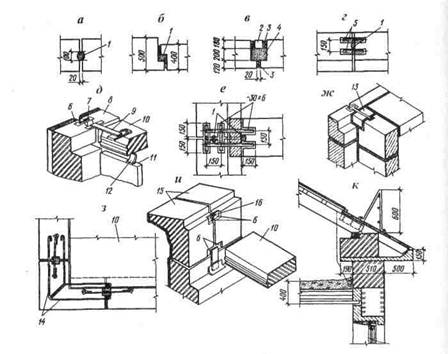 г — связь блоков наружных стен; д — связь перекрытий со стенами;