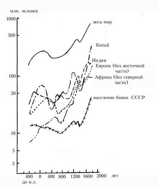 Из графика видно практически повсеместное снижение абсолютной численности народонаселения в середине и второй половине I тыс., связанное с массовыми миграциями, войнами, гибелью многих государств того времени. Затем прогрессивная тенденция демографических процессов стабилизировалась, особенно в Европе.