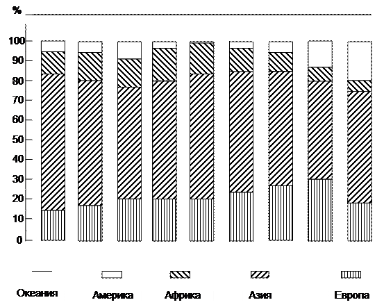 Динамика соотношения численности населения по континентам наглядно видна на нижеследующем графике: