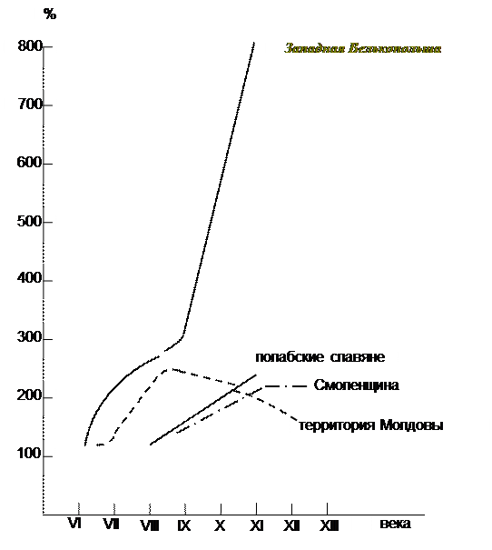 Обратимся к Центральной и Восточной Европе. Исходя из количества поселений и могильников, славянское население середины I тыс. определяется (по разным методикам) в 2,7 – 4 млн. На территории Беларуси проживало 80 – 100 тыс. человек. Демографические процессы во второй половине I тыс. здесь были противоречивыми и зависели в разных регионах от конкретной ситуации, что видно из приведенных графиков. Такие же различия наблюдались и позднее: