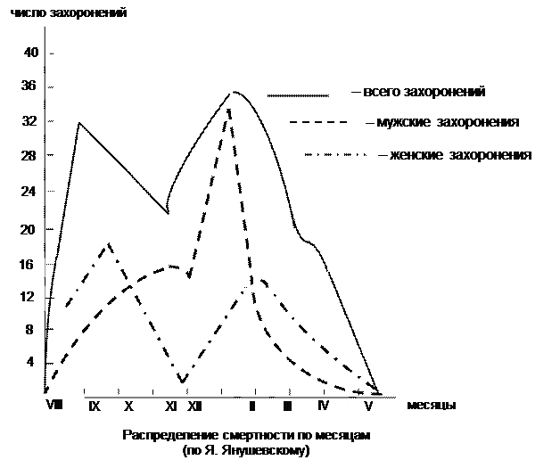 На графике видно явное преобладание смертности с осени по весну, что можно связать с неустойчивостью погоды и атмосферной активностью, усилением влажности воздуха и холодными ветрами. Все это вело к охлаждению организма, стимулировало простудные заболевания, особенно ревматические. Выделяющийся на графике спад смертности в декабре связан, вероятно, с наступлением после осенней слякоти и влажности устойчивой погоды с умеренными морозами. А длинные зимние ночи способствовали более длительному сну, сохранявшему здоровье. Однако последующие зимние месяцы были холоднее и жизненные силы расходовались быстрее. К концу зимы обычно исчерпывались пищевые ресурсы и защитные силы организма, наступал авитаминоз (и теперь пик эпидемий гриппа приходится на конец января – март). Более выраженный спад в декабре женской смертности может свидетельствовать об их большей зависимости от погоды.