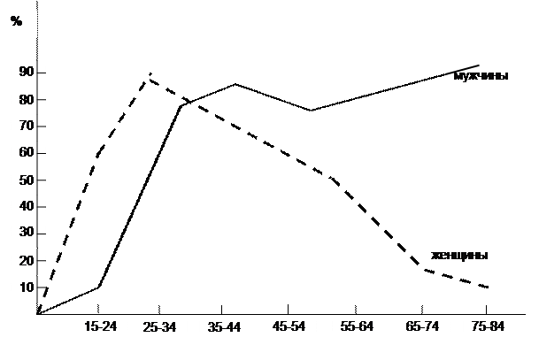 Но урбанизация (с X – XII вв.) накладывала определенный отпечаток на городские семьи. Необходимость обеспечивать семью, не столь актуальная в деревне (была бы земля, да и ближайшие родственники помогали), требовала от горожанина обзавестись собственным делом или хотя бы приобрести квалификацию для получения приличного заработка. На это уходили годы, и городские мужчины все чаще откладывали женитьбу до более зрелого возраста. Наоборот, при наличии приданного, разумеется, в соответствии с традицией девушки выходили замуж рано, даже нередко более молодыми, чем в деревне, ибо в ремесленных и купеческих семьях занимались обычно только домашним хозяйством. Значительная разница в возрасте мужей и жен в городских семьях породила обилие вдов «бальзаковского возраста». Это хорошо прослеживается на предлагаемом графике: