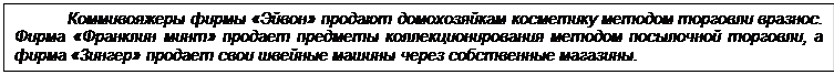 Три основных способа прямой продажи – торговля вразнос, посылочная торговля и торговля через принадлежащие производителю магазины.
