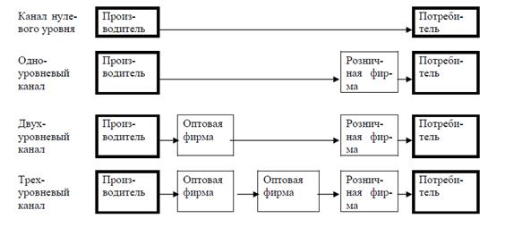 Различают несколько типов каналов товародвижения. По числу уровней, т.е. посредников (звеньев), которые образуют канал, различают: