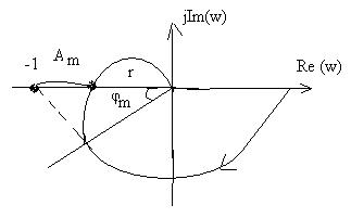 Запас устойчивости по амплитуде Аm равен расстоянию от крайней точки (-1;j0) до ближайшей точки пересечения АФЧХ системы с отрицательной действительной полуосью.